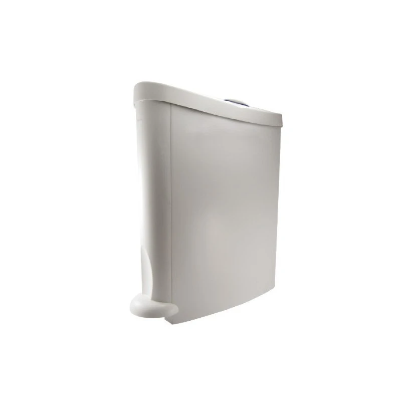 Contenedor higiénico y orgánico de pedal con un diseño delgado que permite ubicarlo en lugares estrechos. Para ser empleados con bolsas de plástico en el interior que se desechan.