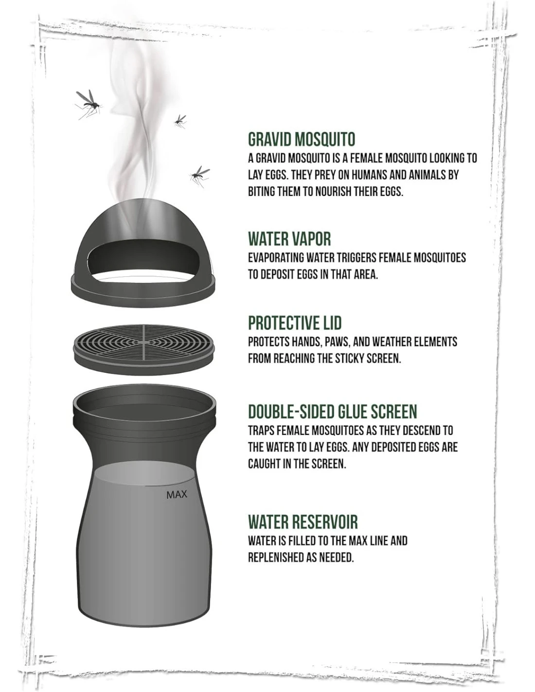 El agua evaporada atrae a los mosquitos hembras a depositar sus huevos, de manera que tanto el mosquito como los huevos quedan atrapados en el filtro adhesivo.
